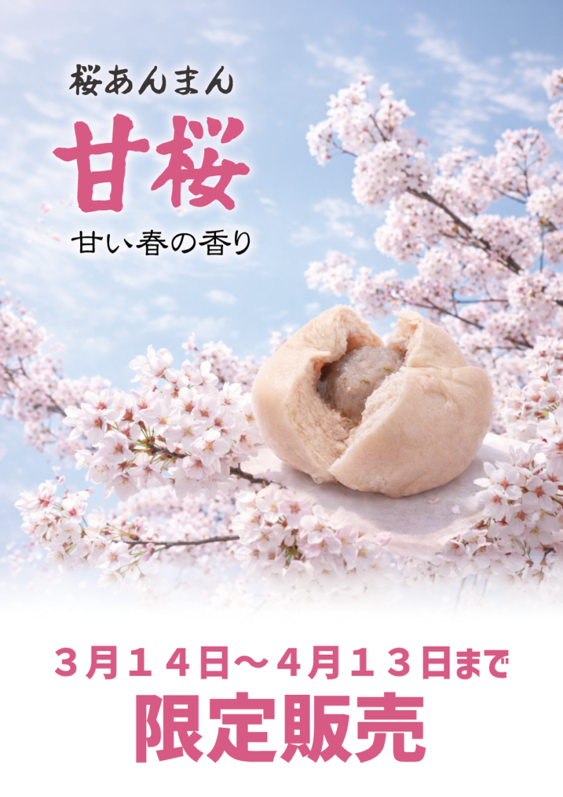 桜あんまん『甘桜』3/14(土)〜4/13(月)限定販売 お知らせ 2026.02.26 太平閣の特製桜あんまん『甘桜』は3/14(土)〜4/13(月)まで、福岡の4店舗、白木原本店、マイング博多店、プラリバ店、五条駅店で販売致します。ご予約も承っております😊 甘桜の紹介ページもぜひご覧下さいませ。是非この機会に美味しい「桜あんまん」を食べて見て下さい😊 甘い春の香り『桜あんまん甘桜』甘い春の香り『桜あんまん甘桜』桜の季節が訪れると思い出す食べ物は🤔…桜あんまんっ☝️😆ナンデ?😅桜葉入りの美味しい餡が魅力な桜あんまん『甘桜』が誕生しました٩( ᐛ )وアマザクラデスー緑茶や紅茶などティータイム🍵に春を感じながら甘〜... ※プラリバ店は専用の休憩スペースがございますのでそちらでゆっくりお召し上がれます( ̄∇ ̄)b